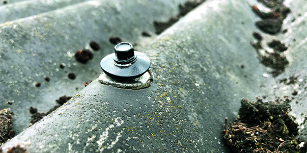 - Hold øje med skruer og tætningsskiver. Skruerne kan have løsnet sig, så tagpladen ikke sidder tilstrækkelig fast. Tætningsskiverne har det ofte med at mørne og miste deres effekt. Vi anbefaler ikke, at du selv laver reparationer på dit eternittag.